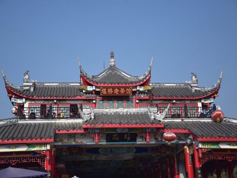 周末的道路如此空旷,行不多时,我们已置身水乡腹地地标段堰桥处,斗拱飞檐的仿古建筑还算精巧别致,也颇有秦砖汉瓦的古风遗韵。 天公真是做美,早早的用万道霞光驱散初冬本该料峭的寒意,照耀着小镇,温润着小镇上身心慵懒的我们。